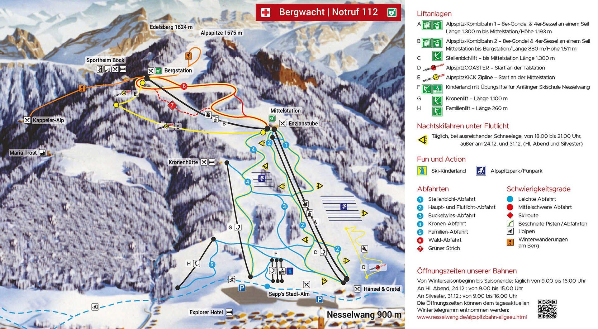 A special leisure highlight in the ski area is the "AlpspitzKick", the longest zipline in Germany. The zipline starts at the Alpspitzbahn mountain station at around 1,500 metres and runs over 1.2 km in two sections down to the middle station. Passengers can reach speeds of up to 120 km/h. The challenging toboggan run also starts about ten minutes' walk from the Alpspitzbahn middle station. The route leads over 1 km and 13 bends into the valley.