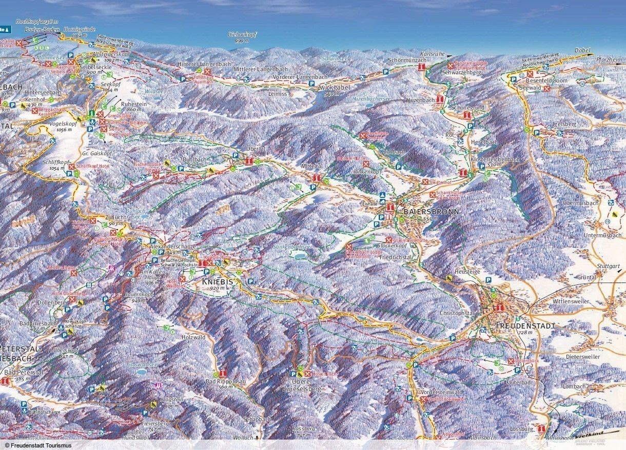 Another cross-country skiing centre is located around the Kniebis above Freudenstadt. Here, over 70 km of trails form a real cross-country skiing Mecca. 14 groomed trails ranging from 2.3 to 10.6 km in length offer beginners and advanced skiers ideal opportunities to burn off energy. The "Kienberg trail", a 6.3 km circular tour around the town, offers a beautiful route with a marvellous view over the town. There is even a night trail on the Kniebis. The 2.3 km circuit is floodlit until 22:00. From here, you also have access to the huge network of trails on the Black Forest High Road, where cross-country skiing opportunities extend up to Mehliskopf and Herrenwies. In total, there is a network of around 120 kilometres of cross-country trails in the northern Black Forest.